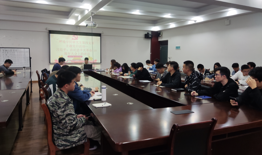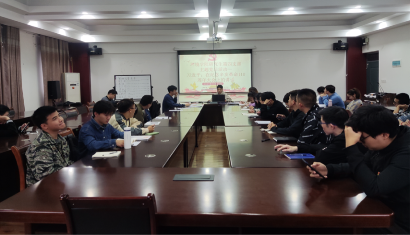 10月20日下午15时,太阳集团2138网址研究生第四党支部在12407会议室开展学习习近平总书记在纪念辛亥革命110周年大会上的讲话主题党日活动,全体党员参加会议,本次会议由支部副书记石谦主持开展。