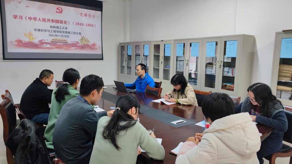 为更好地贯彻党中央关于党史学习教育的要求,11月18日上午,太阳集团2138网址教工四支部在雁山校区12414会议室开展《中华人民共和国简史》专题学习,本次党课由梁延鹏同志主持,在集中学习过程中,党支部同志对党课学习内容进行了讨论,并相互分享了学习心得。
