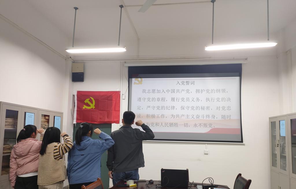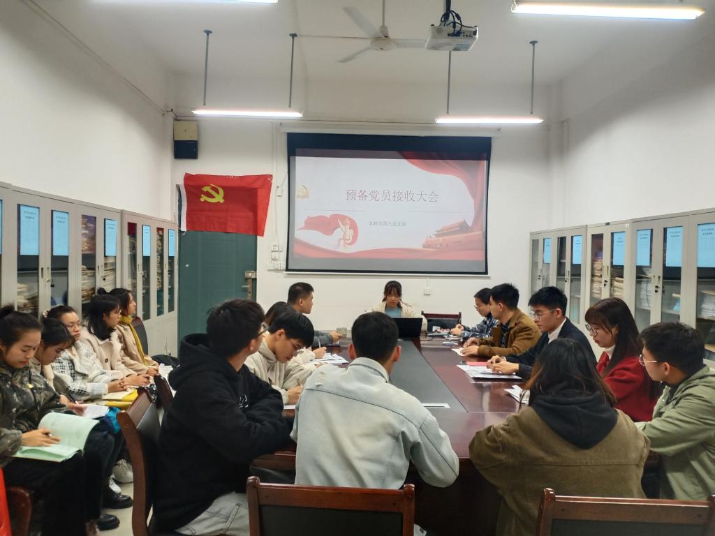 首先,党支部副书记韦春伊同志介绍本次预备党员接收会议流程,并表示会议将严格按照接收预备党员的组织程序进行。接着,发展对象们依次宣读入党志愿书,向党组织汇报自身对党的认识、入党动机、个人经历以及在校期间实际表现等情况。与会党员对各位发展对象们的表现展开讨论,并给予他们建议。会议认为陈观凤等三名同志基本符合党员条件,经正式党员无记名投票表决,同意接收陈观凤等三名同志为中共预备党员。最后,党支部孙云龙书记带领预备党员们面向党旗庄严宣誓。