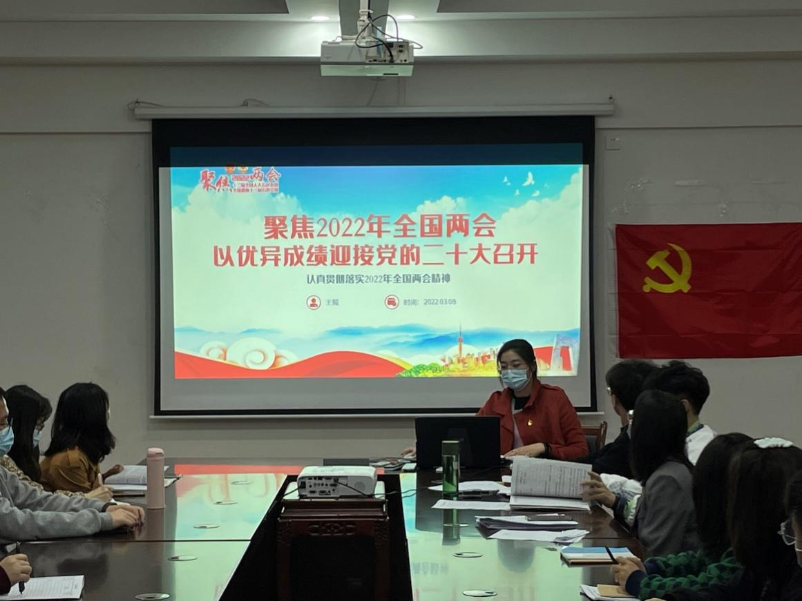 为了加强党员教育管理,发挥党员先锋模范作用。3月8日晚上,太阳集团2138网址研究生二支部在雁山校区萃华楼12407会议室组织开展了关于“2022年全国两会精神”的主题党课。支部书记及支部全体党员同志参加会议,本次主题党课由支部书记王媛老师主持。