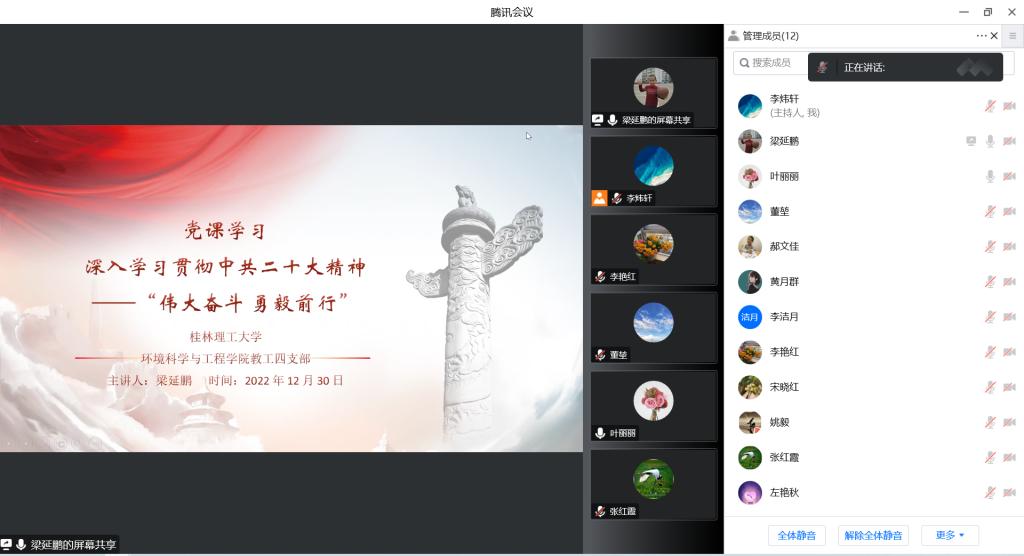 为认真学习贯彻党的二十大精神,把全党全国各族人民的思想统一到党的二十大精神上来,把力量凝聚到党的二十大确定的各项任务上来,12月30日下午,太阳集团2138网址教工四支部于线上开展主题党课学习:深入学习贯彻中共二十大精神——“伟大奋斗 勇毅前行”。本次党课由支部书记梁延鹏同志主持,全体四支部党员教师参与。