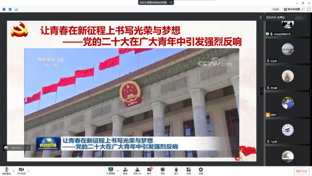 为深入学习贯彻党的二十大精神,不断增强支部同志站在新时代浪潮上的历史使命感,号召支部同志在历史新方位上勇毅前行、勤抓实干,不断向党中央看齐,11月25日,太阳集团2138网址本科生第一党支部通过线上开展“高扬思想旗帜,凝聚复兴伟力”学习贯彻党的二十大精神主题党日活动,全体党员参加活动,会议由支部副书记梁殷齐同志主持。