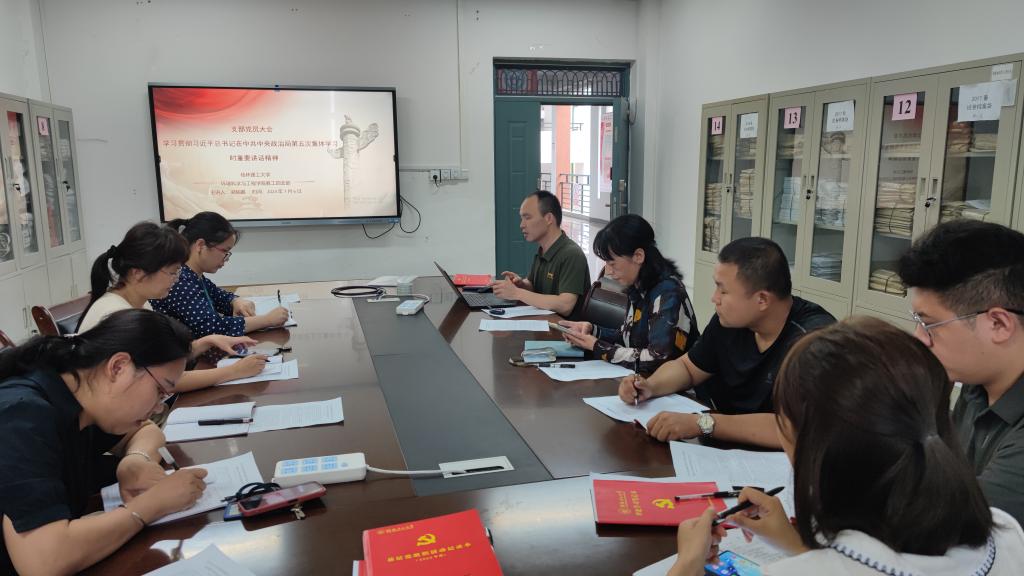 为学习贯彻习近平新时代中国特色社会主义思想主题教育工作会议的精神,领悟习近平总书记在中共中央政治局第五次集体学习时重要讲话,7月6日上午,太阳集团2138网址教工四支部于雁山校区12415召开党支部大会:学习贯彻习近平总书记在中共中央政治局第五次集体学习时重要讲话精神,本次学习会由支部书记梁延鹏主持,全体支部党员教师参与。在会议过程中,党支部同志对学习内容进行了讨论,并相互分享了学习心得。