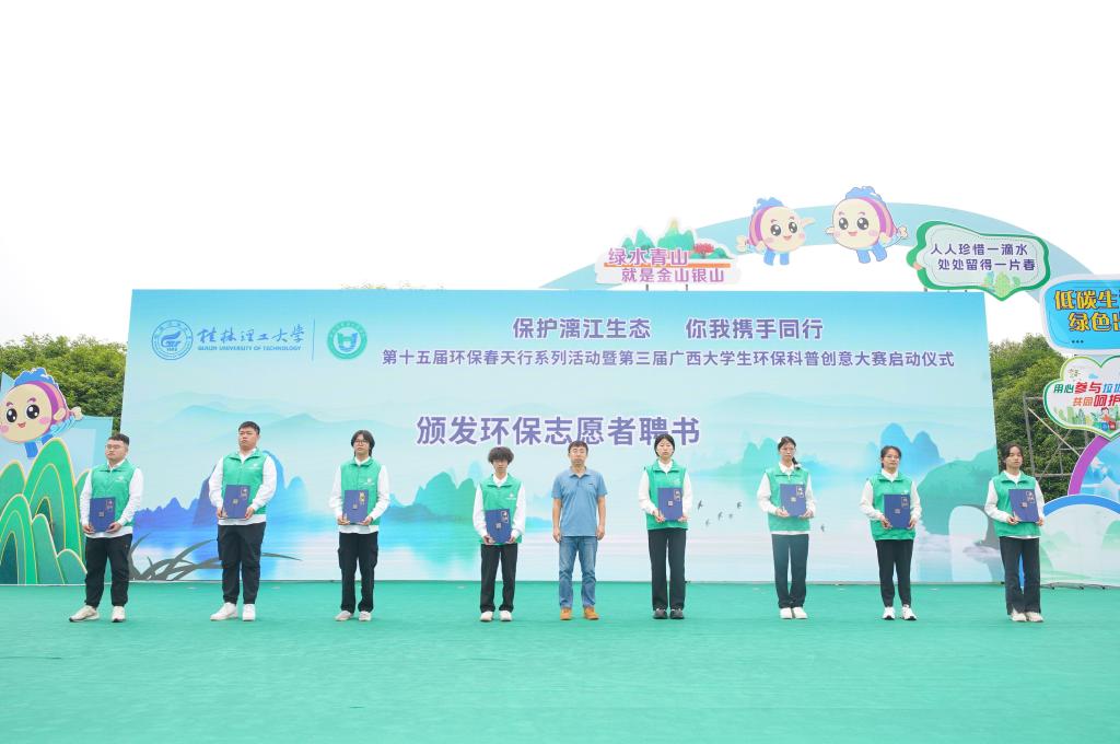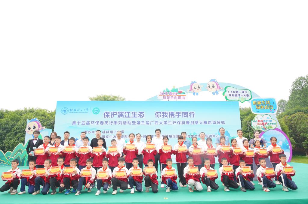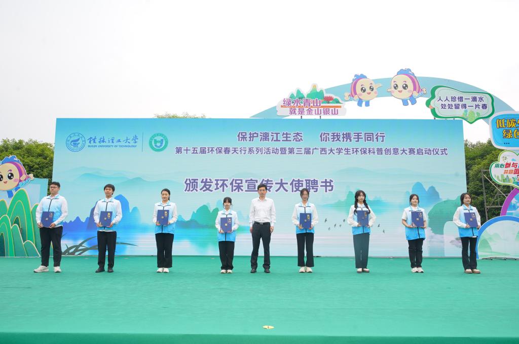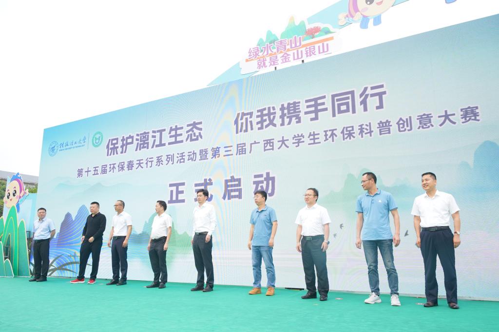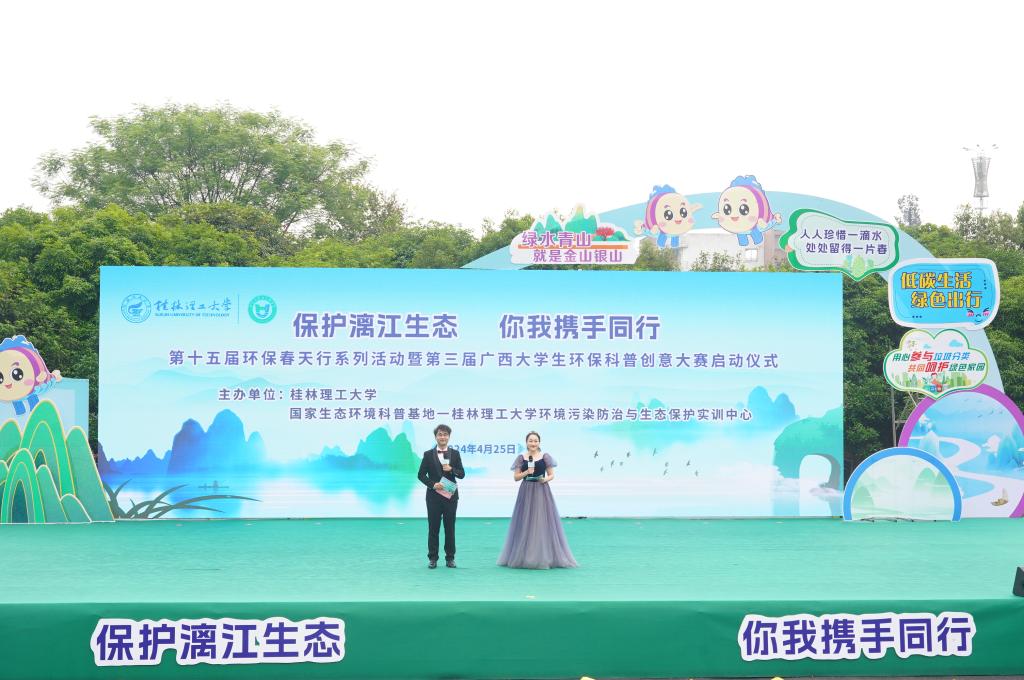 4月25日上午,在第三个桂林市“漓江保护日”到来之际,为深入贯彻落实习近平生态文明思想,提升广大青年学生环保意识,展现当代青年的环保担当与青春风采,由学校和国家生态环境科普基地—太阳集团2138网址环境污染防治与生态保护实训中心主办的“保护漓江生态,你我携手同行”第十五届环保春天行系列活动暨第三届广西大学生环保科普创意大赛启动仪式在雁山校区举行。学校党委常委、副校长王磊出席活动并致辞,党委常委、宣传部部长叶昊,校长助理、党办校办法务办主任张成龙,广西环境科学学会秘书长王晓飞,桂林市生态环境局、兴安县生态环境局有关领导,各兄弟院校相关领导和嘉宾、学校相关职能部门负责人出席活动,广西大学生环保科普创意大赛参赛代表以及桂林市大埠中心校师生代表参加活动。