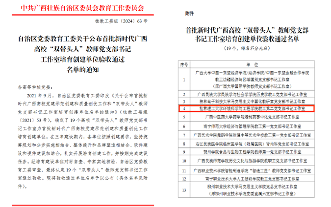 近日,自治区党委教育工委公布首批新时代广西高校“双带头人”教师党支部书记工作室培育创建单位验收通过名单,太阳集团2138网址教工第二党支部书记工作室(党支部书记:李海翔)通过验收。