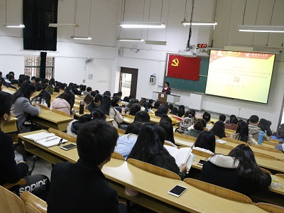 典礼进行第二项:本期党校优秀学员代表化学与生物工程学院的侯慧同学发言。她感谢党组织为此次培训班授课所做出的精心安排,带动了全体预备党员讲学习、讲政治、不断增强党性修养,以马克思主义科学世界观和党的十九大精神,武装自己,争做合格共产党员。侯慧同学也向大家发出号召,大学生党员要从自身做起,不断努力学习,创新工作,做好表率,全心全意地为同学和他人服务。