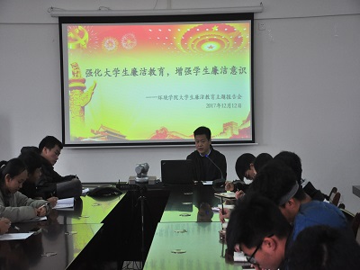 为贯彻落实十九大精神,宣传反腐倡廉理念,强化大学生廉洁自律和风险防范意识,根据学校《关于组织开展2017年秋季学期“廉政教育活动周”的通知》要求,2017年12月12日上午,太阳集团2138网址在雁山校区萃华楼12407会议室组织开展大学生廉洁教育主题报告会,此次报告会有学院党委书记王璐老师主讲,全院班团干部参加主题报告会。