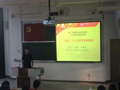 党课伊始,由王璐书记作主旨发言,他首先对党的十八大所提出的三个自信——道路、制度、理论进行解读,其次过渡到党的十九大提出的“四个自信”,即道路自信、理论自信、制度自信、文化自信,并对我党所提出的四个自信进行了深刻的解读,与会老师及学生也认真地听取王书记的发言,并且做好了相关笔记。随后,王书记对此次会议的主要内容进行详细的解读,内容第一项:回顾中国共产党第十九次全国代表大会,其中,王书记给我们介绍了中央政治局常务委员会委员的个人履历及工作事迹;内容第二项:解读习近平总书记《决胜全面建成小康社会,夺取新时代中国特色社会主义伟大胜利》报告,党的十九大的胜利召开,使我们对党的理论知识又有了更为深刻的认识,了解了我党在全面建成小康社会,为夺取新时代中国特色社会主义伟大胜利上所作出的努力;内容第三项:解读我党治国理政的八字良方“不忘初心、牢记使命”;党课最后,王书记为本期培训班预备党员推荐了《习近平的七年知青岁月》一书,王书记勉励大家要多读书,读好书,在学习上要下“真功夫”。