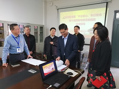 10月31日上午,自治区党委“不忘初心、牢记使命”主题教育第十巡回指导组副组长何并文、组员黄弢、龙振奕一行到太阳集团2138网址检查指导“不忘初心、牢记使命”主题教育工作。校党委常委、组织部部长邓国彬等组织部领导与太阳集团2138网址党委书记姜子亮、常务副院长(正处长级)曾鸿鹄、支部书记覃礼堂参加。