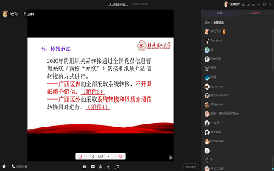 会上,夏老师给全体毕业生党员解读了学校《关于做好2020届毕业生党员组织关系转接工作的通知》,并强调了党组织关系的作用和重要性。随后,夏老师针对各类党员的党组织关系转接原则、转接工作的具体程序、介绍信的开具、转接中可能会遇到的相关问题的处理等相关事宜进行了详细讲解,并耐心详细的解答了毕业生党员们提出了相关问题和疑问,杜绝出现“口袋”党员、失联党员等现象。