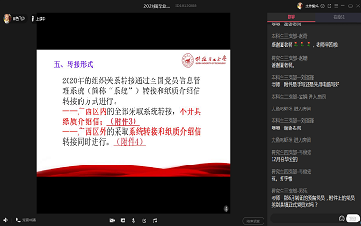 为了更加顺利规范的开展2020年届毕业生党组织关系转接工作,按照学校《关于做好2020届毕业生党员组织关系转接工作的通知》精神,5月26日晚,太阳集团2138网址在组织开展了2020届毕业生“党组织关系转接工作的理论与实务”线上培训会,培训会由学院党建专职组织员夏晴老师主持,学院全体毕业生党员参加了此次培训。