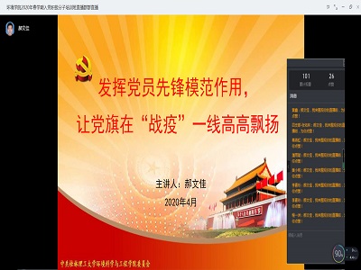 4月15日晚上,学院党委副书记郝文佳通过钉钉线上开展了“发挥党员先锋模范作用,让党旗在‘战疫’一线高高飘扬”的专题党课,培训班全体入党积极分子聆听了专题党课。