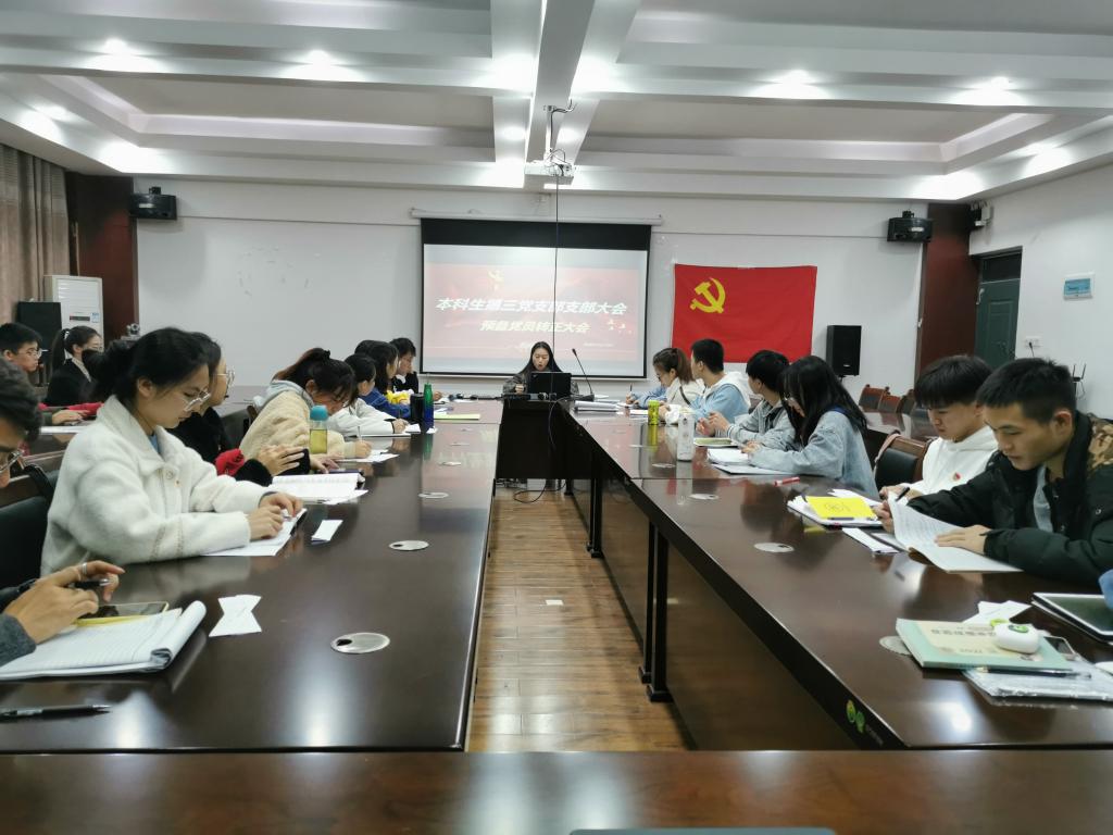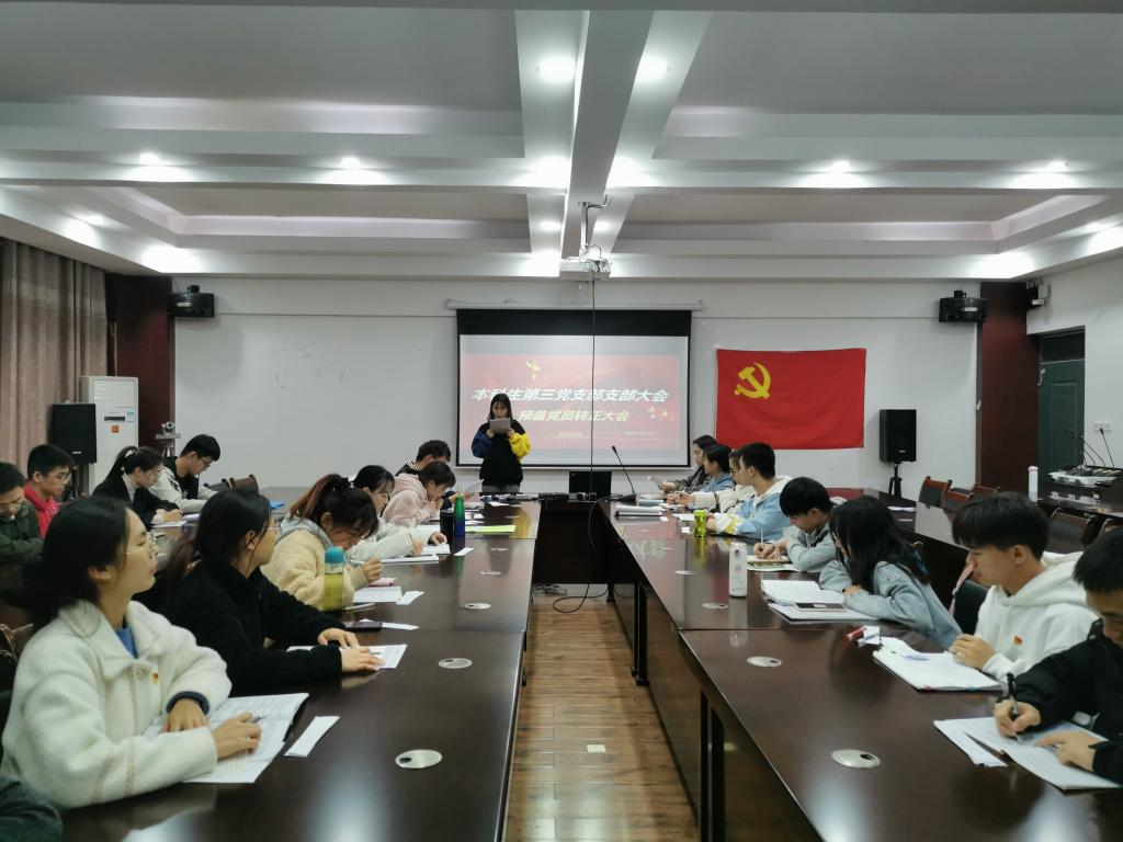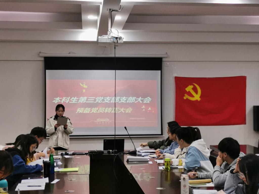 11月23日晚,太阳集团2138网址本科生第三党支部在雁山校区12407会议室组织召开预备党员转正大会,本次会议由党支部副书记张颖颖主持会议,全体党员同志参加会议。大会主要讨论杨诗琪、唐栎涵、代彬、连英涵、王紫维、黄慧敏和龙飘七名同志转正的问题。