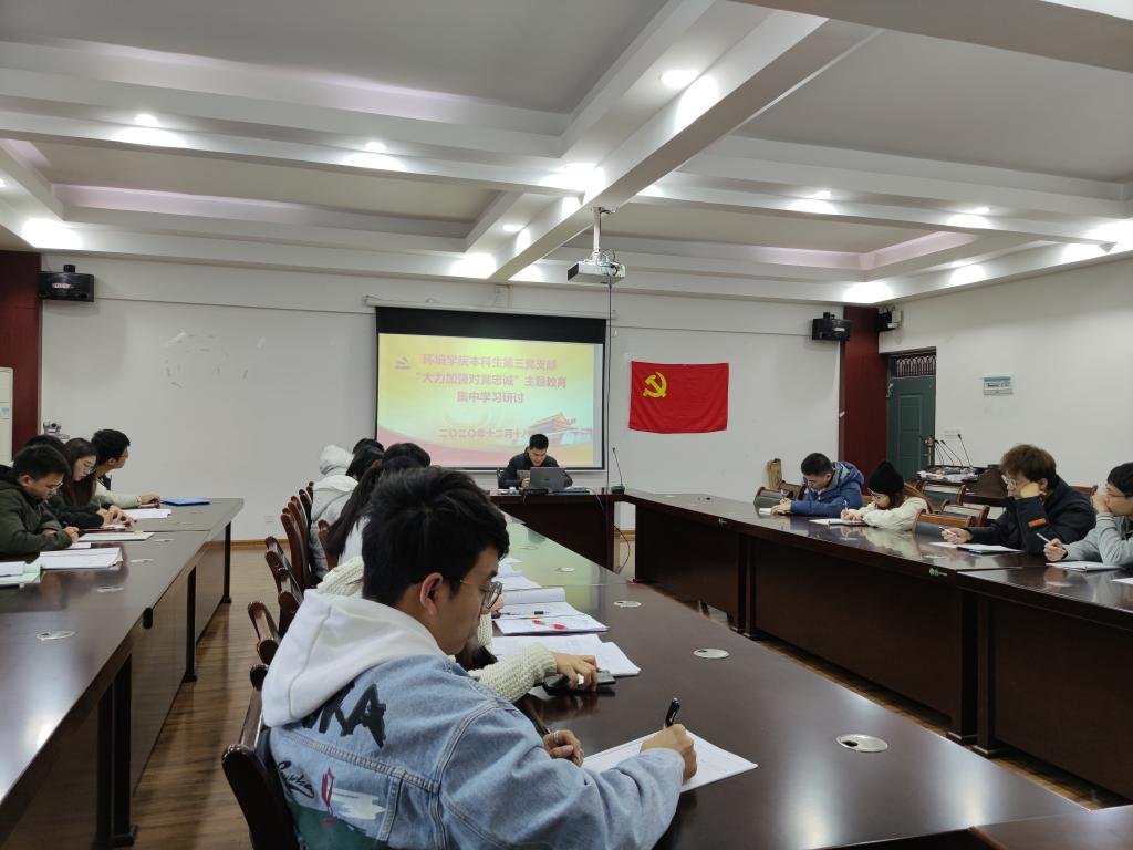 为进一步加强“不忘初心、牢记使命”长效机制建设,强化对党忠诚教育,将党中央、自治区党委部署要求落到实处,2020年12月18日晚,太阳集团2138网址本科生第三党支部在12407会议室开展了“大力加强对党忠诚”主题教育集中研讨,本次党课由支部书记孙云龙同志主持。