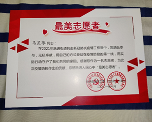 马星琢同学在大难面前有担当有情怀的行为受到当地群众的好评,石家庄市经济广播(石家庄频段FM100.9)与马星琢同学进行了连线并分享了做抗疫志愿活动的心得。街道办为他颁发了奖状与纪念品。