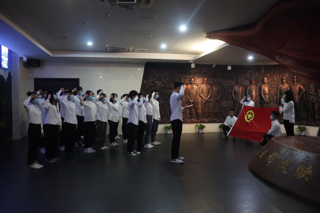 进入八路军办事处纪念馆,青年学生们跟随讲解员参观学习,从中了解到革命战争时期桂林市涌现出的英雄事迹,感受到革命志士为革命理想壮烈牺牲的大无畏精神。在《抗日烽火映桂林》雕塑前,党员代表杨智钧带领青年们重温入党誓词,“为共产主义奋斗终身”的铮铮誓词,震撼着在场每一位青年人。随后团员代表黄英才带领同学们重温入团誓词,青年学生们目光投向团旗,声音响亮。