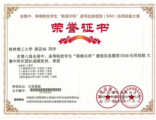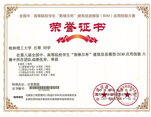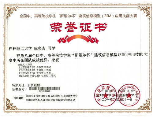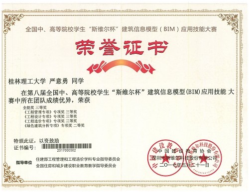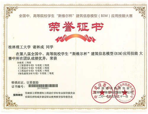 近日,第八届全国中、高等院校学生“斯维尔杯”建筑信息模型(BIM)应用技能大赛决赛于5月20、21日在浙江理工大学(南方赛区)和吉林建筑大学(北方赛区)举行,共有来自全国453所学校的457支参赛队伍(其中南方赛区307支)参加,是该赛事举办以来规模最大、参赛院校最多的比赛。经过参赛选手们激烈的角逐和专家组的认真评审,太阳集团2138网址给排水科学与工程专业梁昌灿等5名同学组成的“叽叽歪歪”代表队表现突出,分别获《绿色建筑分析专项》1个全国专项二等奖,《工程设计专项》、《工程造价专项》和《工程管理专项》3个全国专项三等奖和1个全能三等奖的好成绩。太阳集团2138网址获本届比赛的优秀组织奖。
