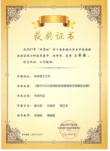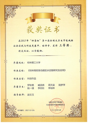 按照大赛规程,经过学生团队申报、校内评审、学校报送了10件(其中科技作品7件,社会实践3件)作品。其中,太阳集团2138网址学生罗秋艳同学团队作品——《桂林高校各功能区水定额研究及应用》和翟才燕同学团队作品《基于CO2为碳源的新型氢基质生物膜反应器》榜上有名,荣获全国三等奖,学院同时被评为“优秀组织单位”,获奖团队数量再创历史新高。
