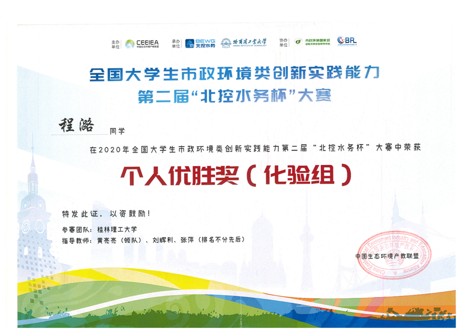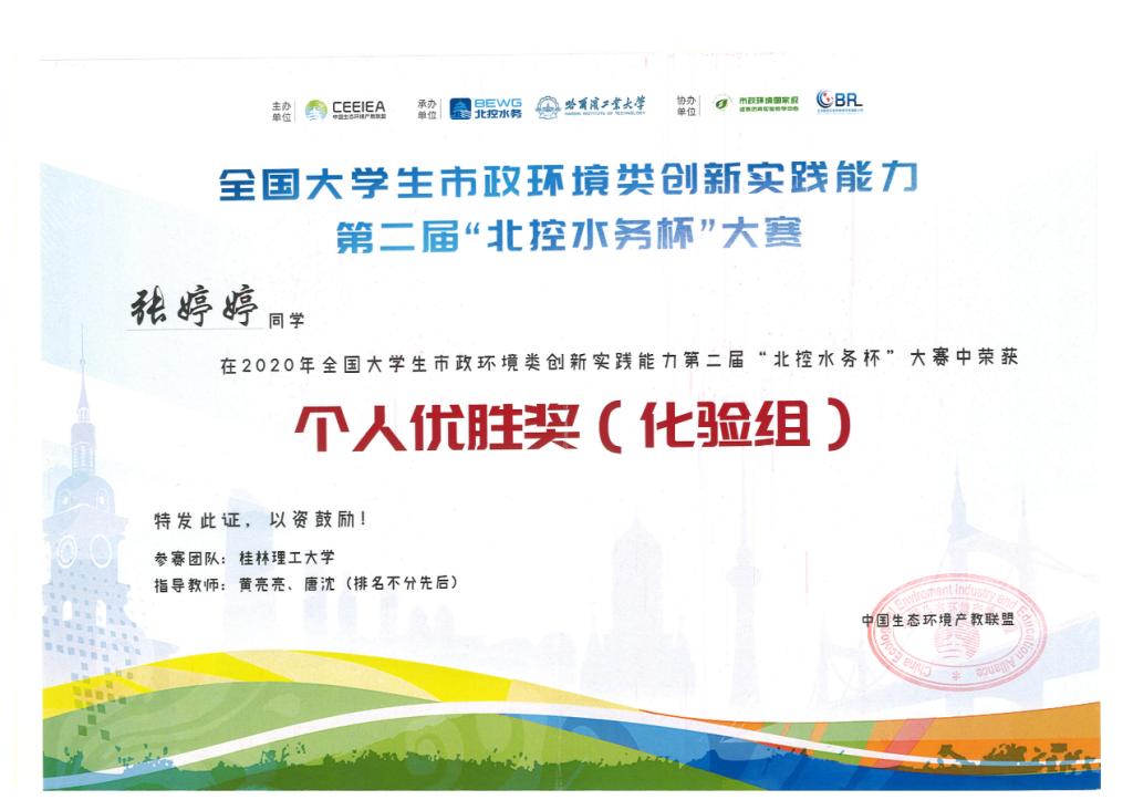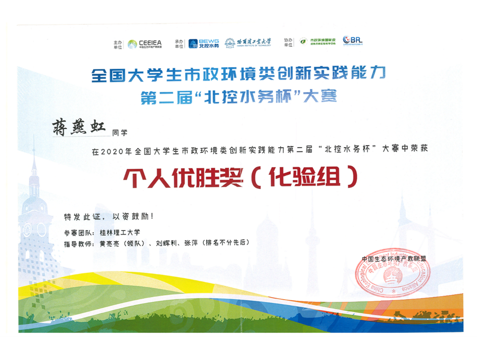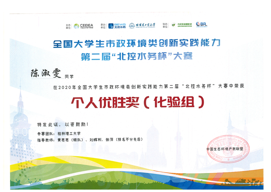 太阳集团2138网址学生在刚刚结束的全国大学生市政环境类创新实践能力第二届“北控水务杯”大赛中获得佳绩,张婷婷、蒋燕虹、陈淑雯和陈璐四位同学获得“个人优胜奖(化验组)”,其中蒋燕虹更是获得96.5分的好成绩。